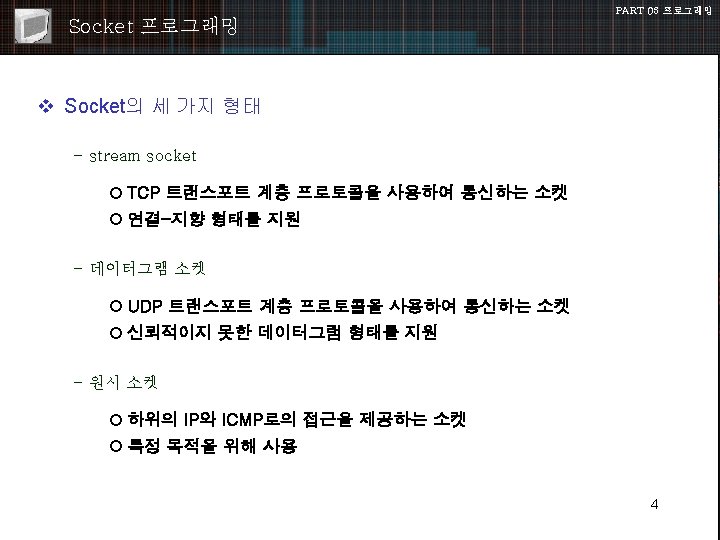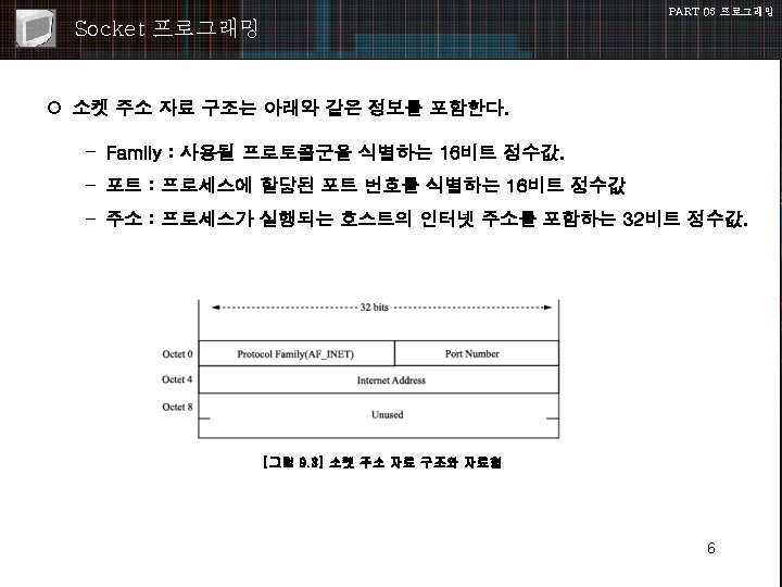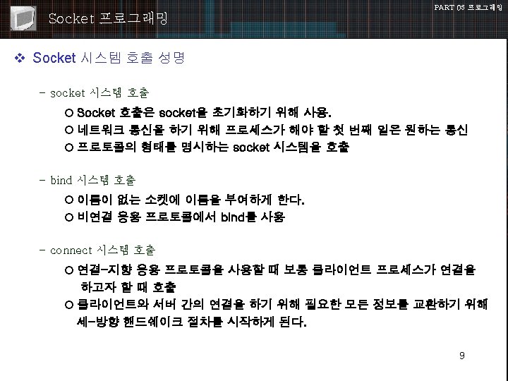 TCP 서버 함수 (3/8) v bind() 함수 사용 예 050 051 052 053 054 055 056 SOCKADDR_IN serveraddr; Zero. Memory(&serveraddr, sizeof(serveraddr)); serveraddr. sin_family = AF_INET; serveraddr. sin_port = htons(9000); serveraddr. sin_addr. s_addr = htonl(INADDR_ANY); retval = bind(listen_sock, (SOCKADDR *)&serveraddr, sizeof(serveraddr)); if(retval == SOCKET_ERROR) err_quit("bind()");