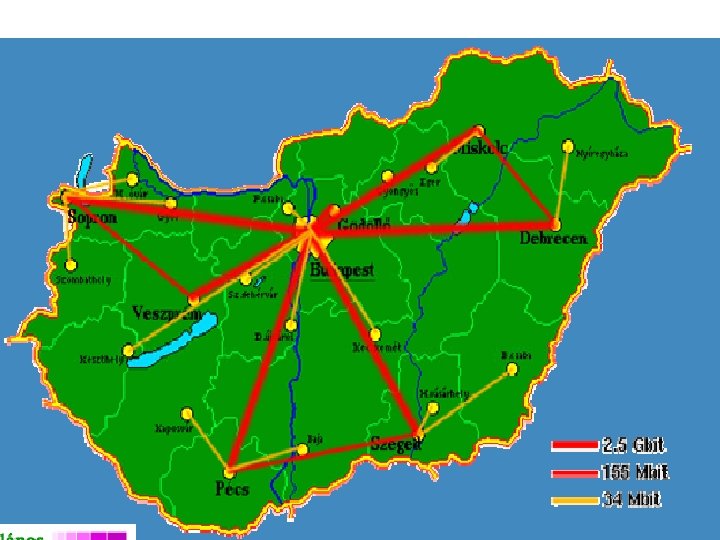 Internet alapjai • Sávszélesség: (bandwith) – Telefonos (dial-up) kapcsolat 14400 bit/sec – 56000 bit/sec (56 kbit/sec) – UPC kábelmodem / ADSL kapcsolat ~ 512000 bit/sec – 0. 5 megabit/sec – Akadémiai hálózat – 2. 5 gigabit/sec • Miskolci Egyetemi Hálózat - 1995