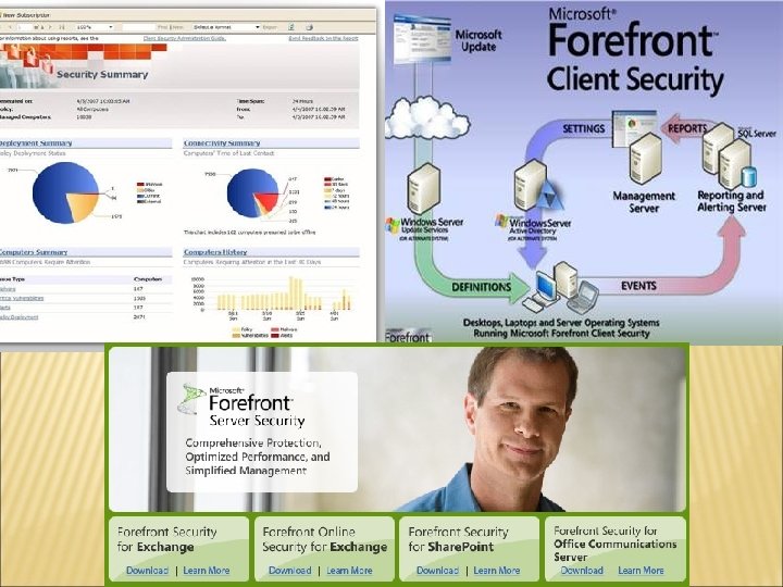 � Client � � � Server � � � Antivirus Antispyware Antitrojan Autumatic security update Cleint security managment Sharepoint Server Exchange Server Office communication Server System Management Server Edge (security managment) � Forefront TGM (MS ISA Server)