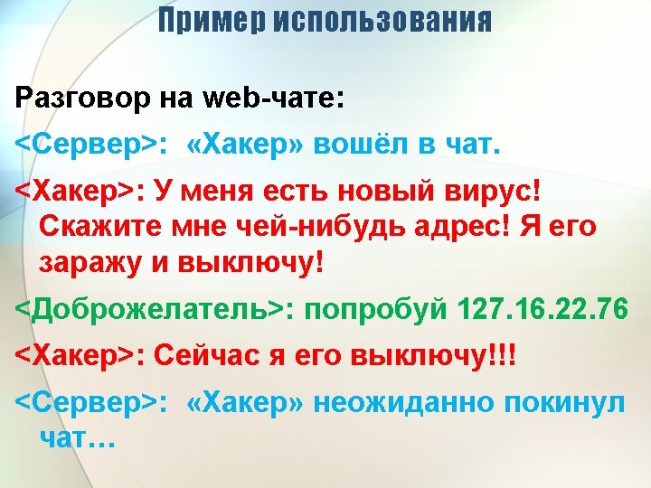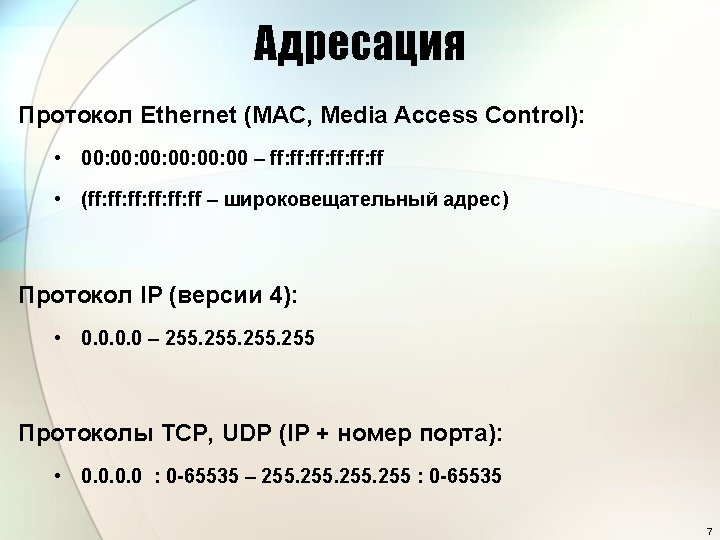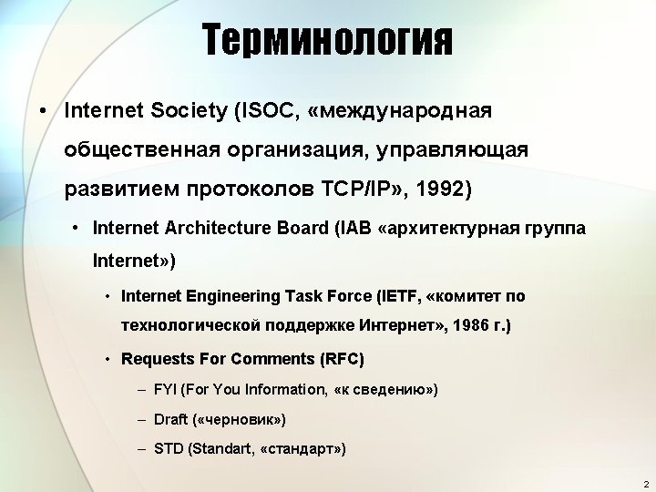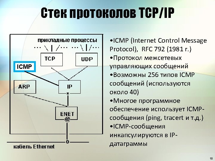 TCPIP TCP Transmission Control Protocol UDP User Datagram Slides: 26 Download presentation Стек протоколов TCP/IP • TCP (Transmission Control Protocol) • UDP (User Datagram Protocol) • IP (Internet Protocol) • ARP (Address Resolution Protocol) • ENET (Ethernet) 6 Стек протоколов TCP/IP • TCP (Transmission Control Protocol) • UDP (User Datagram Protocol) • IP (Internet Protocol) • ARP (Address Resolution Protocol) • ENET (Ethernet) 11 Стек протоколов TCP/IP • TCP (Transmission Control Protocol) • UDP (User Datagram Protocol) • IP (Internet Protocol) • ARP (Address Resolution Protocol) • ENET (Ethernet) 14 Использование ICMP D: >ping 10. 140. 244. 217 Pinging 10. 140. 244. 217 with 32 bytes of data: Request timed out D: >ping 192. 110. 1. 140 D: >ping 192. 110. 1. 40 Pinging 192. 110. 1. 40 with 32 bytes of data: Pinging 192. 110. 1. 140 with 32 bytes of data: Destination unreachable Reply from 192. 110. 1. 40: bytes=32 time<10 ms TTL=64 20