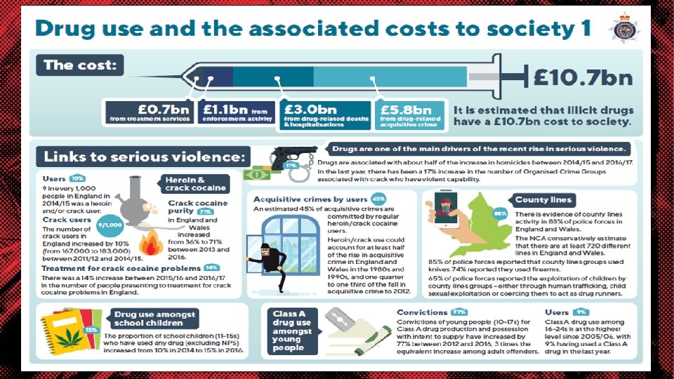 What’s the real damage • Drug related deaths are at the highest recorded level UK - 5543 (ONS) • Around 1 in 11 adults aged 16 -59 used a controlled drug in the past year (ONS) • Around 1 in 5 (20%) of 16 to 24 yr olds used a controlled drug in the past year – That’s 1. 3 million people (ONS) • 14% increase between 2015/16 and 2016/17 in the number of people presenting to treatment for crack cocaine problems in England (Source: NHS digital / NPCC) • In excess of 40 k people arrested in the UK for possession offences (Mo. J) • There approx. 300 k people registered with Heroin addiction (PHE) • A black person, is 11. 8 times more likely to be convicted of possessing cannabis than a white person (Release drugs, Stopwatch, LSE - colour of injustice)