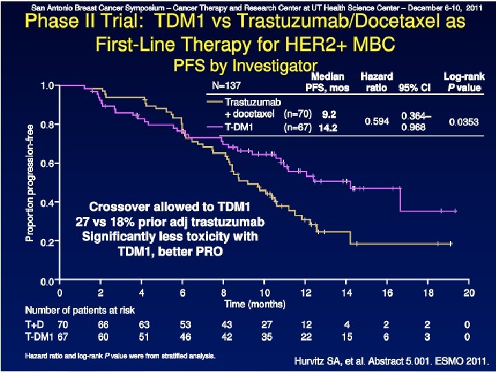 PFS for Patients Treated With Trastuzumab-Containing Regimens TPC (T-containing) (n=149) Median (months) 3. 2 No. of events 101 Proportion progression-free 1. 0 0. 8 T-DM 1 (n=404) 6. 2 219 Stratified HR=0. 558 (95% CI, 0. 437, 0. 711) P<0. 0001 0. 6 0. 4 0. 2 0. 0 0 2 4 6 8 10 12 14 Time (months) No. at risk: TPC 149 99 50 20 12 5 1 0 T-DM 1 334 241 114 66 27 12 0 404 2013 Unstratified HR=0. 54 (P<0. 0001). 111