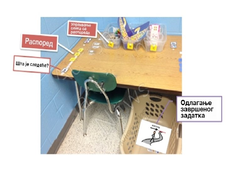 Fizička organizacija • • • Jasne prostorne granice između različitih zona Prostor organizovan tako da smanji distrakciju Vizuelni signali pomažu osobi sa autizmom da razume šta se od nje očekuje u određenom prostoru