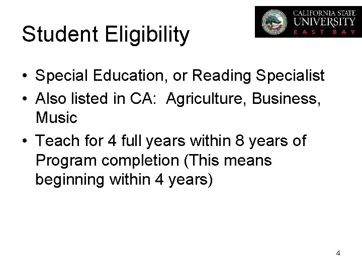 Student Eligibility • Special Education, or Reading Specialist • Also listed in CA: Agriculture, Business, Music • Teach for 4 full years within 8 years of Program completion (This means beginning within 4 years) 4