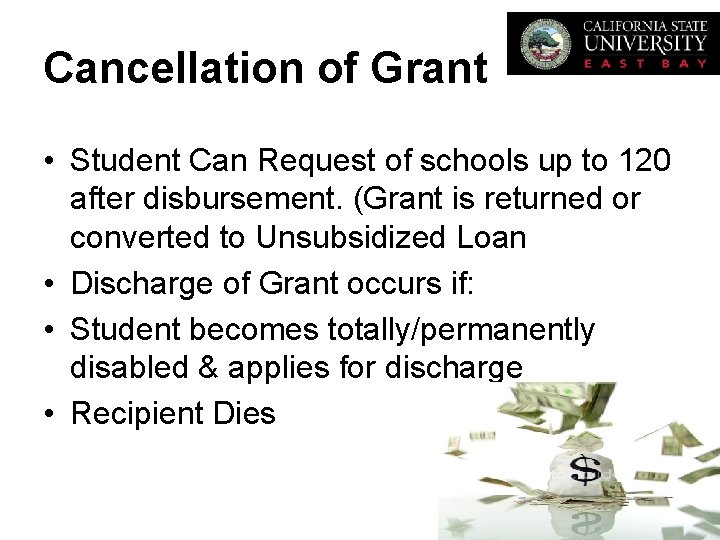 Cancellation of Grant • Student Can Request of schools up to 120 after disbursement. (Grant is returned or converted to Unsubsidized Loan • Discharge of Grant occurs if: • Student becomes totally/permanently disabled & applies for discharge • Recipient Dies 5