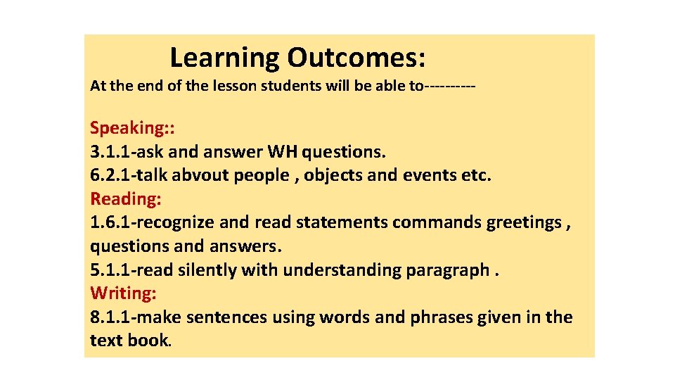 Learning Outcomes: At the end of the lesson students will be able to----- Speaking: : 3. 1. 1 -ask and answer WH questions. 6. 2. 1 -talk abvout people , objects and events etc. Reading: 1. 6. 1 -recognize and read statements commands greetings , questions and answers. 5. 1. 1 -read silently with understanding paragraph. Writing: 8. 1. 1 -make sentences using words and phrases given in the text book.