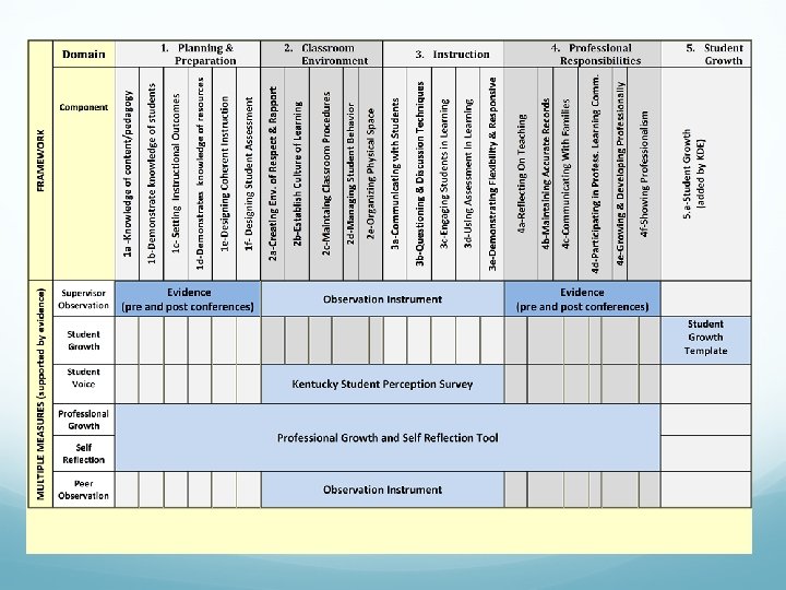 Learning Targets I can. . • identify and explain the proposed multiple measures of the Teacher Professional Growth and Effectiveness System. • navigate the Kentucky Framework for Teaching, and reflect on my own teaching practices. • connect specific data collecting instruments to their corresponding domains in the Kentucky Framework for Teaching.