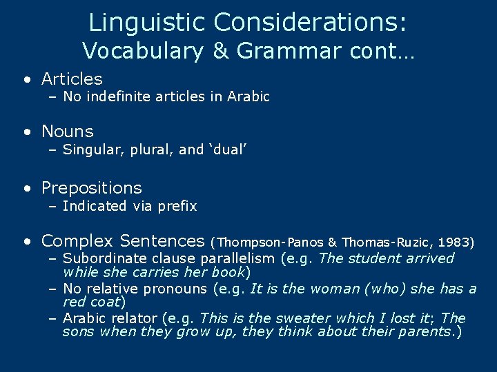 Linguistic Considerations: Vocabulary & Grammar cont… • Articles – No indefinite articles in Arabic • Nouns – Singular, plural, and ‘dual’ • Prepositions – Indicated via prefix • Complex Sentences (Thompson-Panos & Thomas-Ruzic, 1983) – Subordinate clause parallelism (e. g. The student arrived while she carries her book) – No relative pronouns (e. g. It is the woman (who) she has a red coat) – Arabic relator (e. g. This is the sweater which I lost it; The sons when they grow up, they think about their parents. )