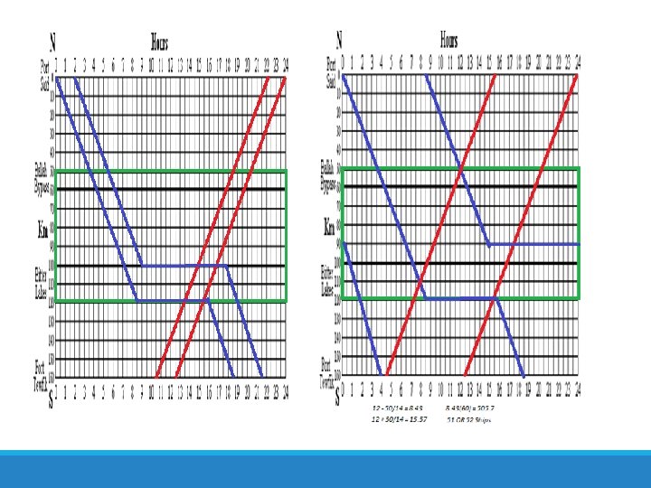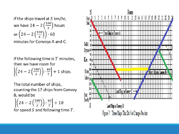 Time for Convoy A to reach Bitter Lakes: 100/14 = 7. 14 Length of yellow region (in hours): 24 – 2(7. 14) = 9. 72 Length of yellow region (in minutes): 9. 72(60)/10 = 58. 3 Turn this into number of ships! 59 Ships in Convoys A and C.