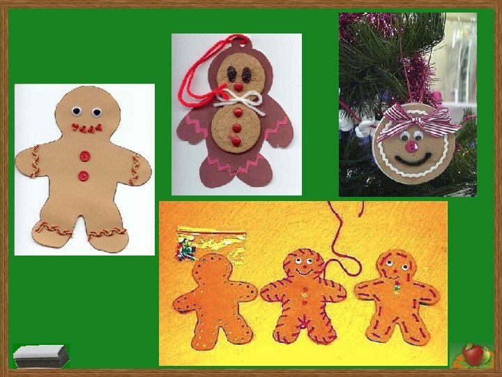Gingerbread Man Recipe Mix all items. Refrigerate overnight. Form small balls (about 4 cm. diameter) to give to each child, so they can shape it into a man or woman. If they don’t use it all, they can make cookies with it. Add M & M’s for facial features. Spray Pam on individual pieces of foil that have been “wadded up” and then smoothed out. Write each student’s name on the foil with a permanent marker. Bake for 10 mins. at 375 degrees Fahrenheit. After the gingerbreads cool, use colored frosting to decorate around the edges. Students can use plastic sandwich bags with holes cut in the corner. They can use cream cheese frosting from a can.