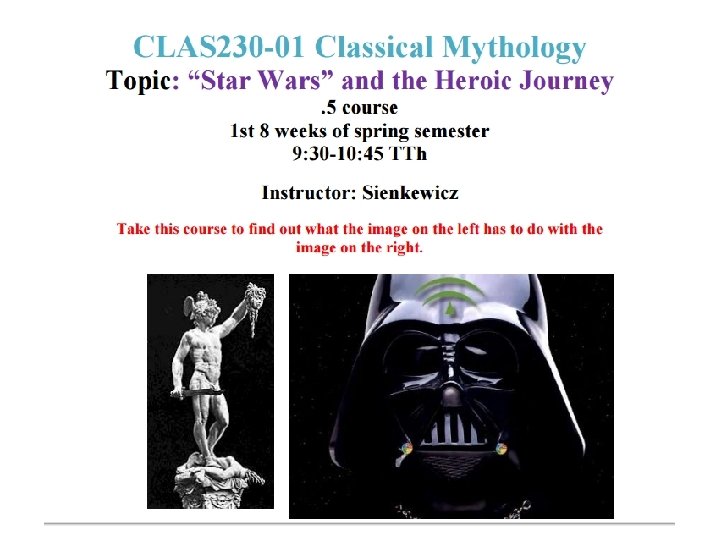 Course Introductions: What is Myth? Star Wars Scene: IV. 1 Opening Powerpoint: What is Myth? American Heritage Dictionary definition Cullen's "Yet Do I Marvel" Sisyphus: Odyssey 11. 593; Apollodorus Note 147; Pausanias 2. 5. 1; Diodorus Siculus 6. 6. 3; Hyginus: #60; Apollodorus 1. 9. 3 On Myths and Sisyphean Tasks Star Wars: The Magic of Myth, 1 -7 Star Wars V. 31 "There is No Try"; "Always with you it can't be done. "