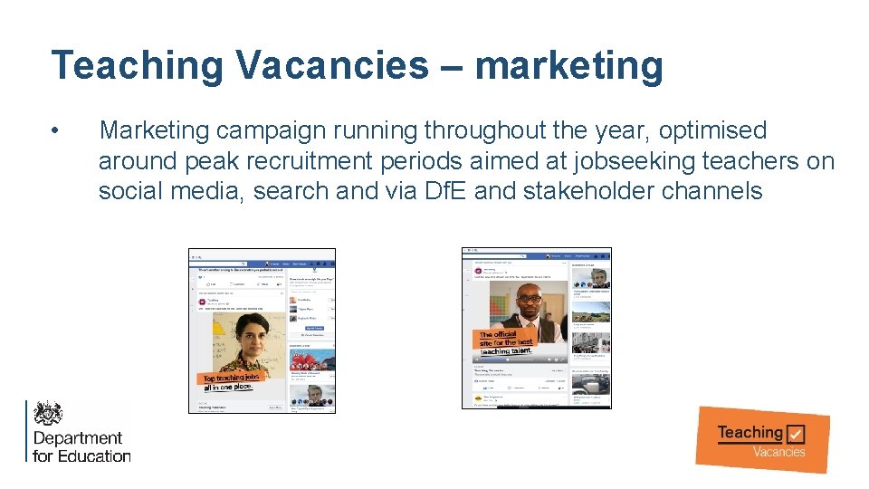 Teaching Vacancies – marketing • Marketing campaign running throughout the year, optimised around peak recruitment periods aimed at jobseeking teachers on social media, search and via Df. E and stakeholder channels