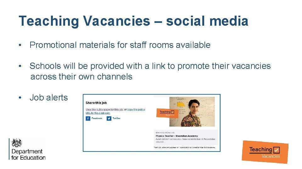 Teaching Vacancies – social media • Promotional materials for staff rooms available • Schools will be provided with a link to promote their vacancies across their own channels • Job alerts