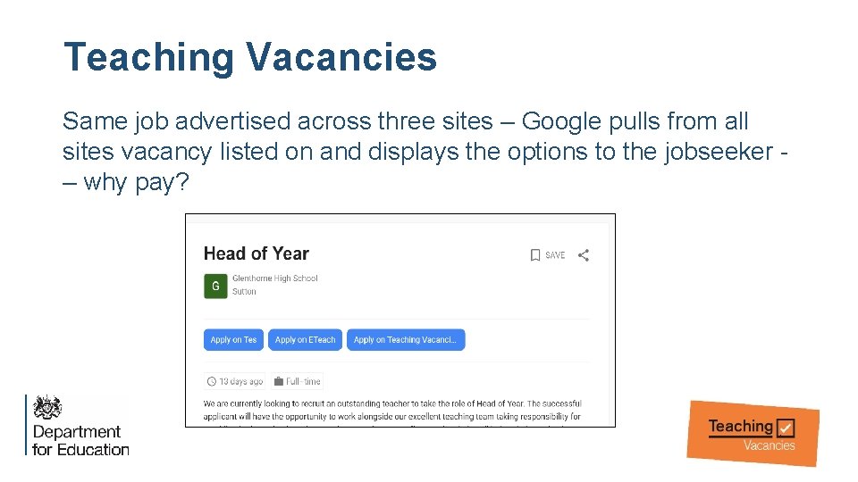 Teaching Vacancies Same job advertised across three sites – Google pulls from all sites vacancy listed on and displays the options to the jobseeker – why pay?