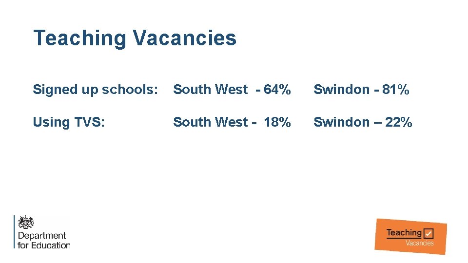 Teaching Vacancies Signed up schools: South West - 64% Swindon - 81% Using TVS: South West - 18% Swindon – 22%