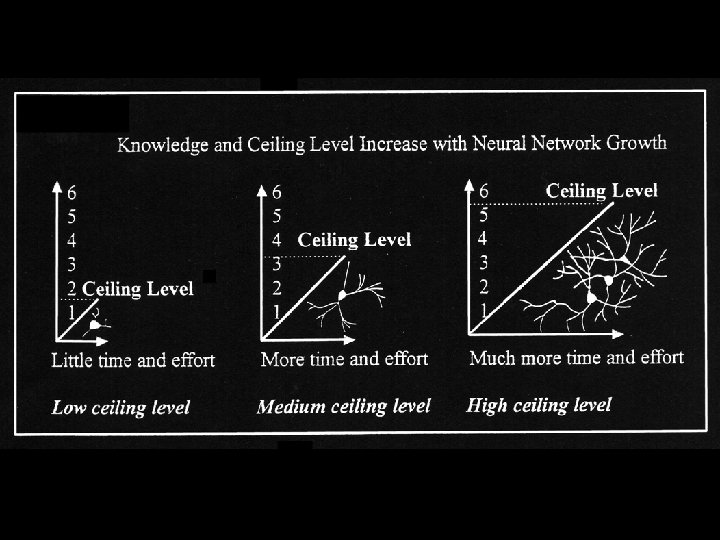 HOW THE BRAIN LEARNS n As we learn (as we experience, practice, process), specific dendrites grow so that specific neurons connect at specific synapses to create larger and morecomplex specific neural networks. n These n The networks are what we know. more we grow, the more we know, i. e. , our ceiling level rises.
