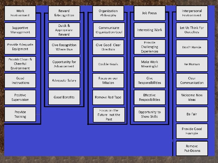 Improve the work To create a work environment where 80 -90% of Employees are motivated Improve system of rewards & recognition Improve Interpersonal Environment Revise Supervisory program Republish all Admin. Teachers offices Improve & ensure opportunity for advancement Improve salary & benefits