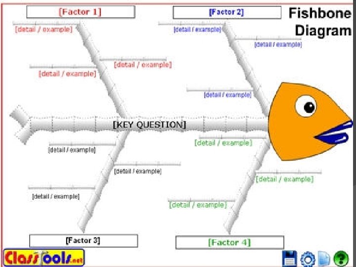 o Fishbone diagram It is also called cause-andeffect diagram. It is a structured form of brainstorming that graphically shows the relationship of possible causes and sub causes directly related to an identified effect/problem.
