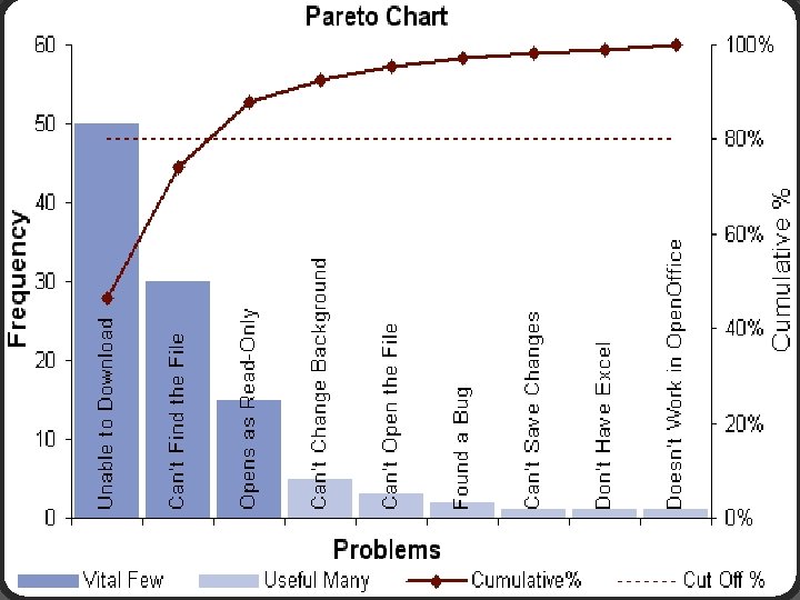o Pareto chart Is a type of bar chart, prioritized in descending order of magnitude or importance from left to right. It shows at a glance which factor are occurring most.