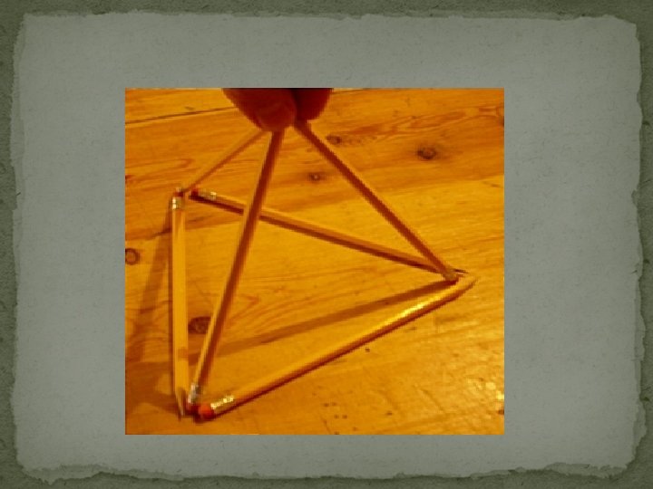 Triangle Puzzle Arrange the pencils/sticks as in the picture Now make four equilateral triangles (same length sides) using the pencils/sticks. Each triangle must be the same size, and every side of each triangle must be the same No breaking pencils