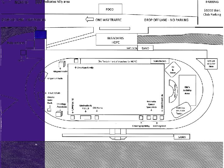 Same Rules, Different Place – Tents with bottoms are not allowed on the field – No long stakes allowed – sprinkler system does not run deep. – Personal generators are allowed but must be filled in the parking area. We ask that everyone turn off the generators during the Remember Ceremony. – If you attended bank night, your team members do not need to check in on the day of Relay, but you need to mark your campsite on the map located near Relay Central. – All Survivors need to check in at the Survivor Tent even if your team checked in at Bank Night.
