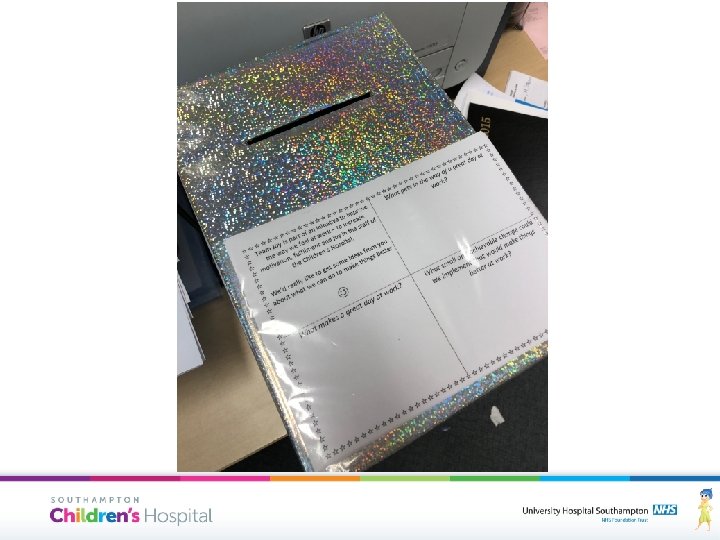 Spreading Joy in Child Health with Team Joy! Our jobs can be tough at times, but also hugely rewarding and satisfying. We are a fantastic team here in child health, who deserve to be enjoying their days at work! As a result, we want your feedback on the following: What makes a great day at work? What gets in the way of a great day at work? Please look out for glittery boxes in staff rooms in which you can provide written feedback, email Team Joy with your suggestions Team. Joy@uhs. nhs. uk Have a joyful day! What is a small and achievable change that would make things better at work? Team Joy Carol Paterson, Mrs Francesca Stedman, Dr Kate Pryde, Dr Jennifer Livings