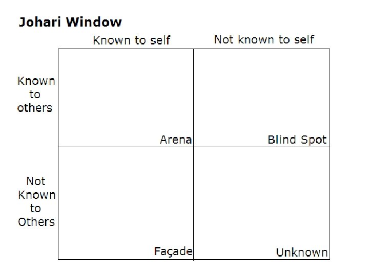 Johari window • Cognitive psychological tool created by Joseph Luft and Harry Ingham in 1955 • A widely used model describing the process of human interaction • A simple yet useful tool for illustrating and improving self-awareness, and mutual understanding between individuals within a group