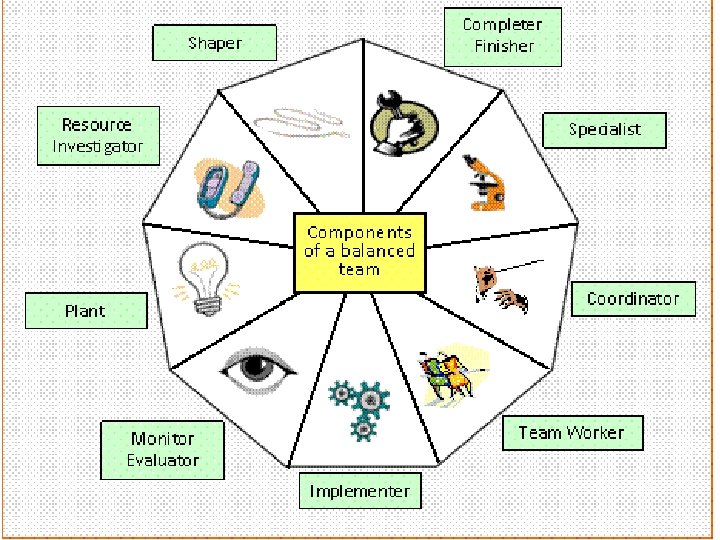 Belbin Team Roles • Dr. Meredith Belbin observed that people in teams tend to assume different team roles • Individuals seem to display different team roles to varying degrees