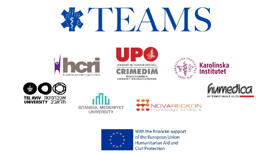 THE PROJECT TEAMS is a project, funded by the European Union Humanitarian Aid and Civil Protection (DG ECHO), aiming to develop, pilot and assess a standardized training package (set of simulation exercises), focused on operational team training (team dynamics) for EMCs/EMTs, adaptable to different types of EMCs/EMTs. Specific aims: 1) To create a training framework focused on operational team training for EMCs/EMTs. 2) To develop teaching materials and identify effective training methods. 3) To implement a low-cost e-learning platform to facilitate the delivery of the teaching materials that is sustainable beyond the project. 4) To design a cost-effective set of simulation-based immersive scenarios for training EMCs/EMTs and facilitating quality assurance of these teams. 5) To pilot the overall training package through two main training events. 6) To assess the effectiveness of the training in terms of learning outcomes, participants’ satisfaction, improvement in technical and non-technical skills of the teams trained and cost-effectiveness. 7) To evaluate the quality of the training package.