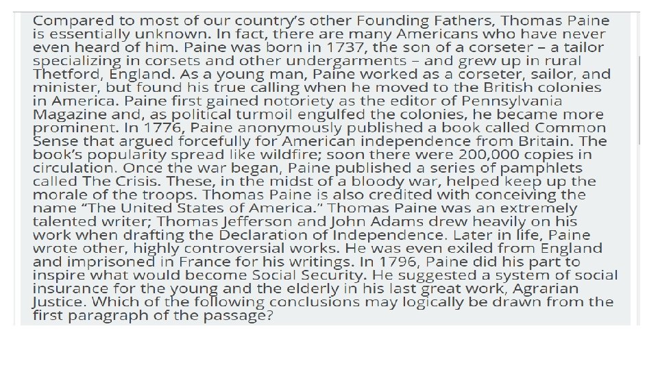 § The questions are often preceded by a long or short passage. It is helpful to read the questions first and then read the passage. This will give you an idea of what to focus on when reading the passage. § You will often see questions beginning with “logically TEAS Reading Tips conclude. ” This is a trap! Don’t be tempted to make assumptions about the text based on your own personal understanding—try to keep to the facts in the text. § Many questions will focus on your ability to determine the difference between opinion and fact. These questions can be tricky if you are not used to them, so practice recognizing the difference between fact (the sky is blue) and opinion (the sky is pretty)