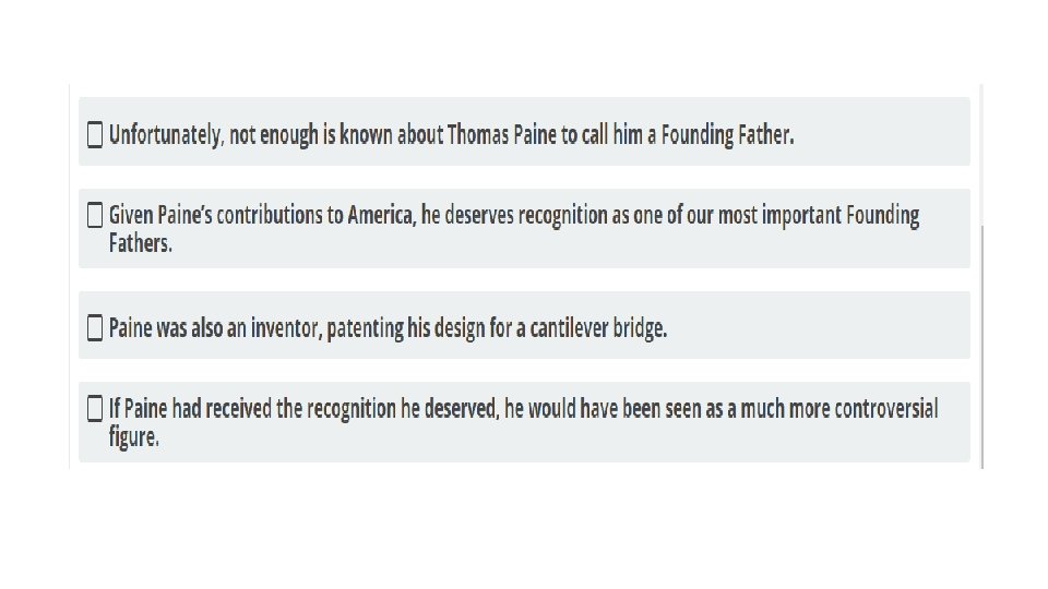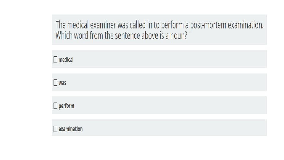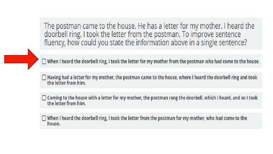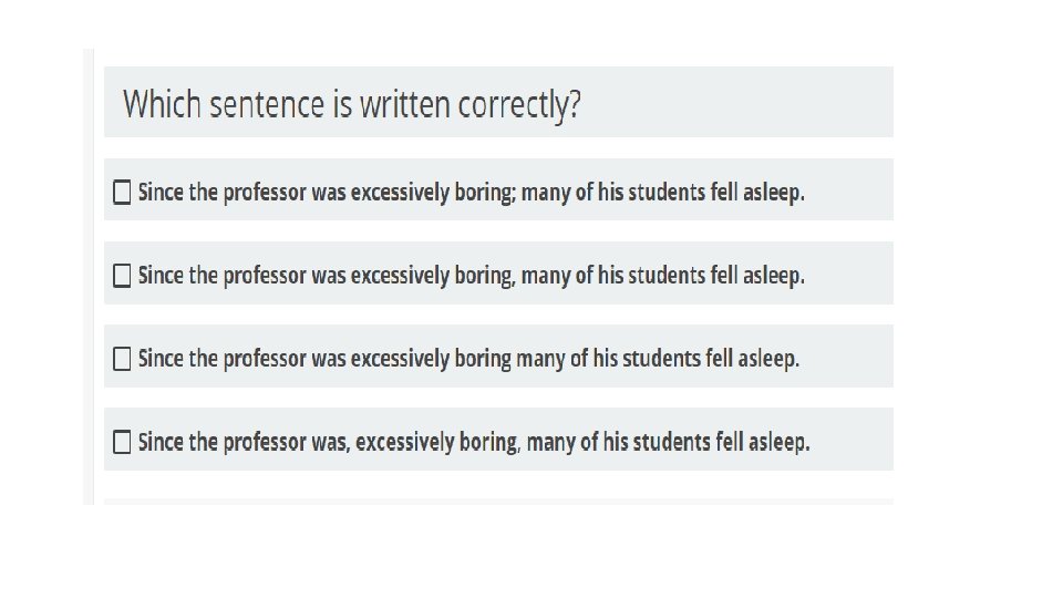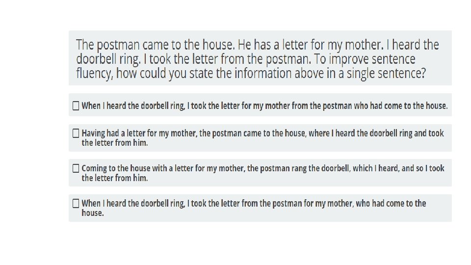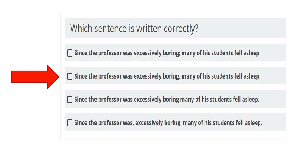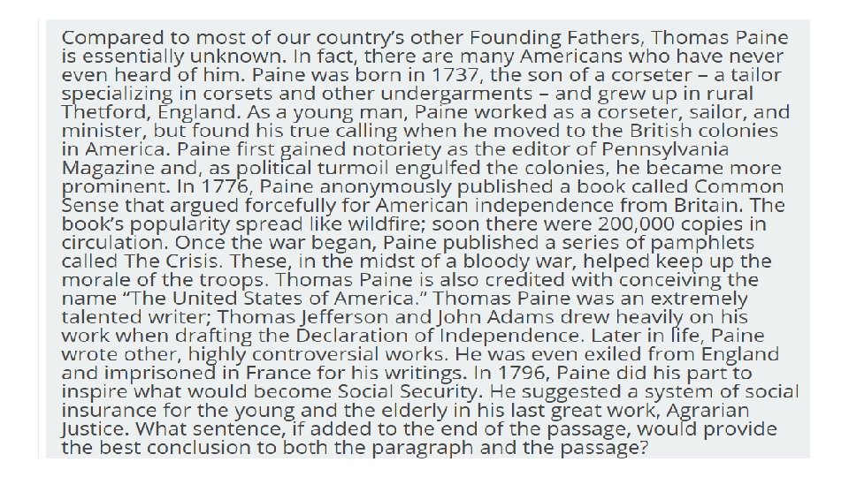 § STEP 1: ANALYZE THE INFORMATION PROVIDED. § Many questions about English and language usage will TEAS English Tips present you with a sentence or short passage and ask you to identify an element of the sentence, complete the sentence correctly, or fix an error. The question will specify what task you are to perform. Read the question and the sentence carefully § Not every question is accompanied by a sentence. Some simply ask you to recall facts. However, the question still contains key terms that you need to apply. The TEAS test has many language arts topics; you might see a question about writing style followed by one about punctuation followed by one about sentence structure. Each time you read a question, give yourself the time it takes for one deep breath to call to mind the particular rules or facts being tested.