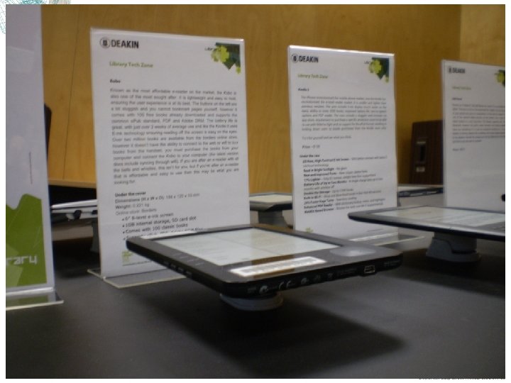 Equipment available in the Tech. Zone Combination of e-readers and tablet PCs alongside product descriptions and information People were encouraged to touch, try out, and question • i. Pad • Pocket Projector • Kindle • Dell Streak • Iliad • Kobo • Kogan • Samsung Galaxy Tab • Sony e-reader