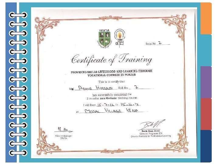 Monitoring • Monitoring is performed by the ITA’s team on a weekly basis through physical verification and mobile technologies ; • Attendance record of trainees and trainers, quality of training, feedback of/from trainees, class room environment/ maintenance & repairs. • Attendance of trainees is 90 -95% • Reporting of District Supervisors to Manager Livelihood/Program Manager • Monitoring by TEVTA teams as well