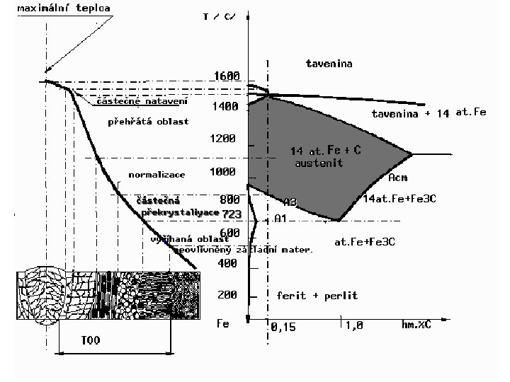 KŘIVKA OHŘEVU PRO ŽELEZO-Fe Za normální teploty má čisté železo strukturu odpovídající krychlové soustavě devíti atomového železa alfa. Po ohřevu dojde při teplotě 769°C k ztrátě magnetických vlastností, ale tato změna neovlivní vzájemnou polohu atomů. Až, při teplotě zhruba 900 °C dojde k podstatné a velmi důležité změně, devíti atomové železo alfa překrystalizuje na čtrnácti atomové železo gama. Při teplotě 1401 °C se železo gama změní na delta a to se pak při teplotě 1539 °C roztaví.