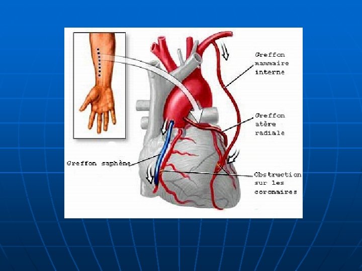 Technique 2 possibilités : n Pont entre l’aorte ascendante et le segment coronaire mal irrigué à l’aide d’une veine (saphène) ou une artère (radiale) n Vascularisation du segment coronaire mal irrigué par une artère mammaire droite et/ou gauche