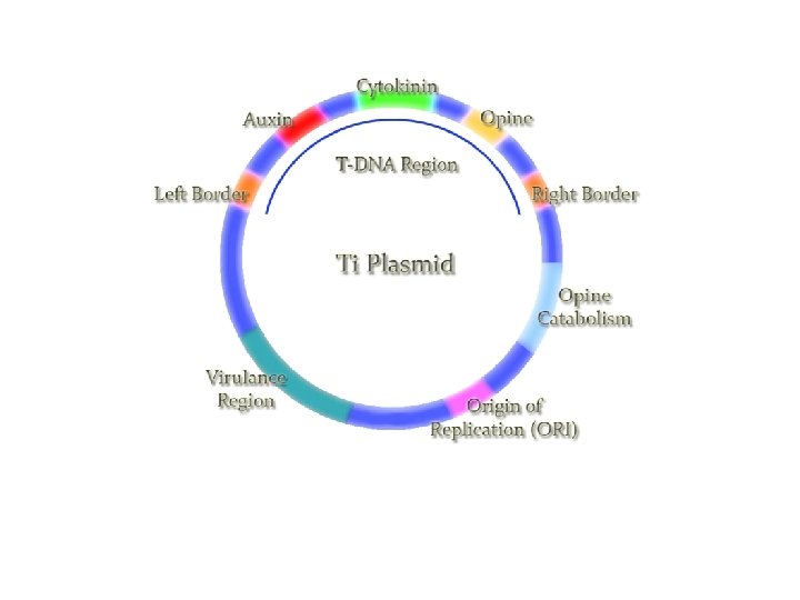 Ti-plasmid features • Two strains of Ti-plasmid: -Octopine strains- contains two T-DNA region: TL (14 kb) and TR ( 7 kb) -Nopaline strains- contain one T-DNA region(20 kb) • Size is about 200 kb • Has a central role in Crown-gall formation • Contains one or more T-DNA region that is integrated into the genome of host plants • Contain a vir region ~ 40 kb at least 8~11 vir genes • Has origin of replication • Contains a region enabling conjugative transfer • Has genes for the catabolism of opines