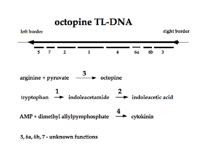 T-DNA • Size~ 12 to 24 kb • Left and right border sequence(24 -bp) which will be transferred into genome of host plant • Oncogenes e. g Auxin, cytokinin, opines • tm 1 gene for determining the tumour size • the T-DNA contains eight potential genes - these are eukaryotic in nature (eukaryotic promoters, monocistronic, eukaryotic polyadenylation signals, eukaryotic translation mechanisms) • crown gall tumorigenesis is due to the "activation" of unregulated phytohormone synthesis in the transformed cells