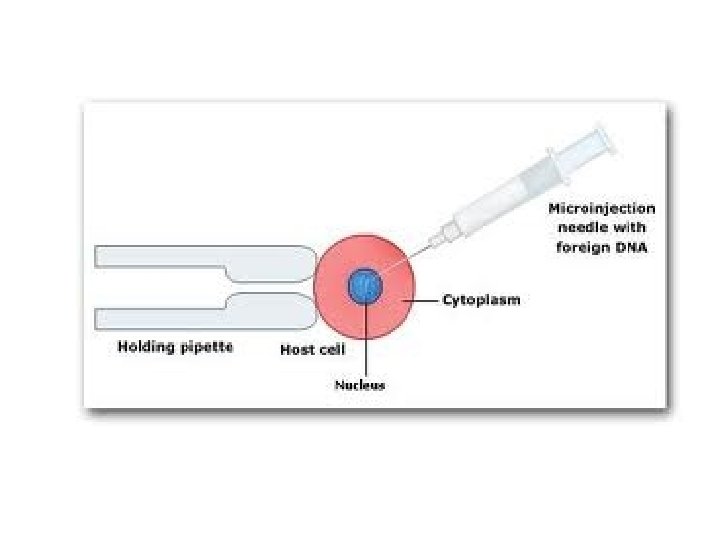Microinjection ØMicroinjection techniques for plant protoplasts utilize a holding pipette for immobilizing the protoplast while an injection pipette is utilized to inject the macromolecule. Ø In order to manipulate the protoplasts without damage, the protoplasts are cultured for from about 1 to 5 days before the injection is performed to allow for partial regeneration of the cell wall. ØIt was found that injection through the partially regenerated cell wall could still be accomplished and particular compartments of the cell could be targeted. Ø The methods are particularly useful for transformation of plant protoplasts with exogenous genes.