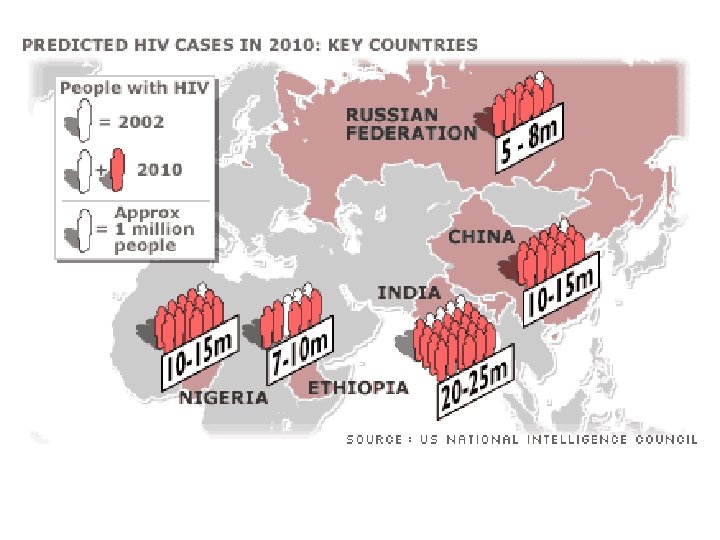 Eastern Europe and Central Asia • HIV infections in eastern Europe and central Asia have soared by 40% - the second-fastest rise in the world. • Russia has the largest epidemic in Europe - an estimated 860, 000 people have HIV there. • The spread of the virus is driven mainly by intravenous drug use, especially among young men. • Condom use is generally low among young people.