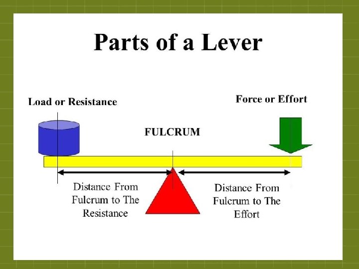 The Lever - A lever has three components: the pivot (fulcrum), the load and the force § In a lever, a moving part rests on the pivot (fulcrum) § At one end of the moving part is the load (the object to be lifted or moved) § A force is applied to the other end of the moving part