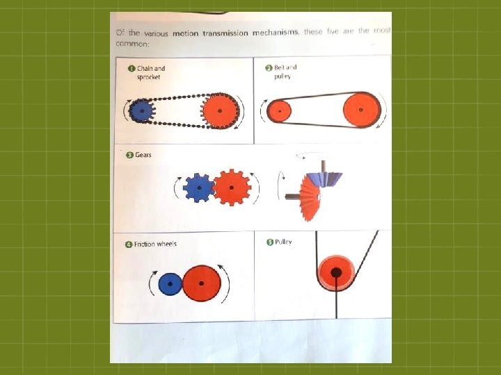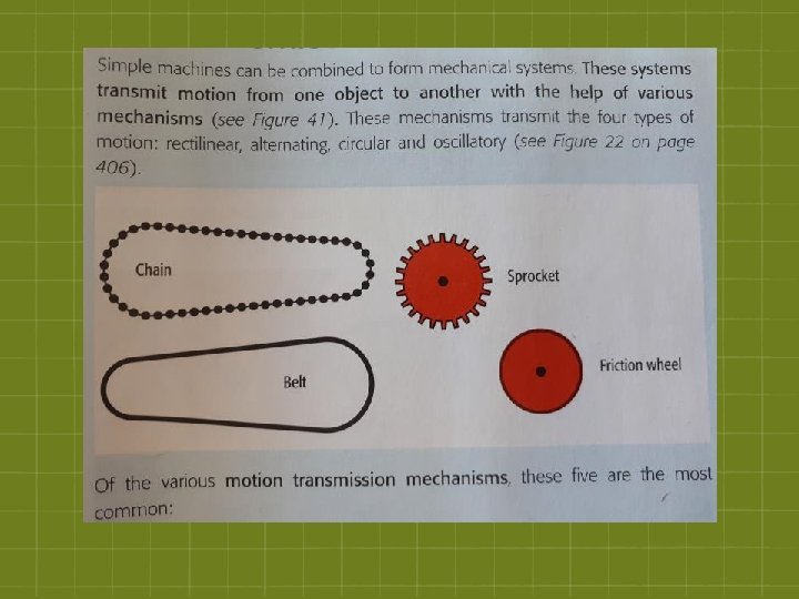 The Transmission of Motion - Simple machines can be combined to form mechanical systems § These systems are used to transmit a movement from one object to another, through different mechanisms Ø The mechanisms transmit the four types of movement: 1) Rectilinear 2) Alternative 3) Circular 4) Oscillatory