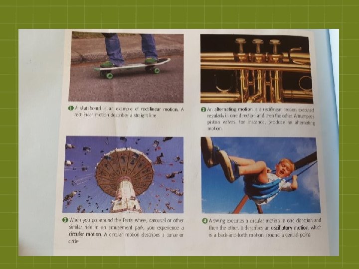 Types of Motion - Scientists believe that all motion is a combination of the following four simple types: 1) Rectilinear motion Ex. A skateboard 2) Alternating motion Ex. A trumpet piston 3) Circular motion Ex. A carrousel or Ferris wheel 4) Oscillatory motion (back & forth around a central point) Ex. A swing