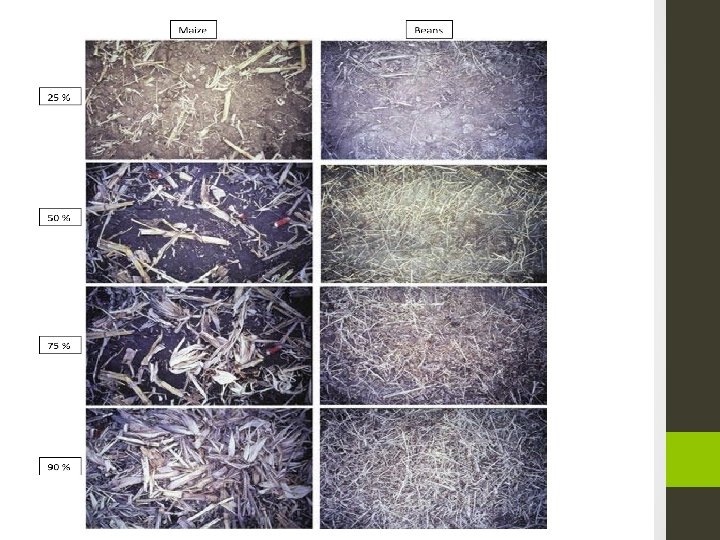 What is conservation tillage? • Conservation tillage is any method of soil cultivation that leaves the previous year's crop residue (such as corn stalks or wheat stubble) on fields before and after planting the next crop, to reduce soil erosion and runoff. • To provide these conservation benefits, at least 30% of the soil surface must be covered with residue after planting the next crop. Some conservation tillage methods forego traditional tillage entirely and leave 70% residue or more.