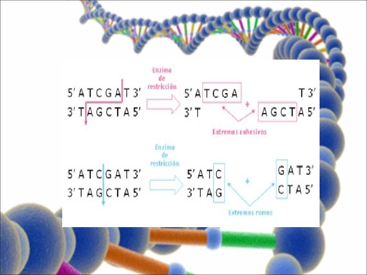 1. CORTE DE FRAGMENTOS DE ADN • Producido por las endonucleasas de restricción bacterianas en las secuencias de reconocimiento (palindrómicas). • Producen extremos romos o pegajosos (cohesivos)