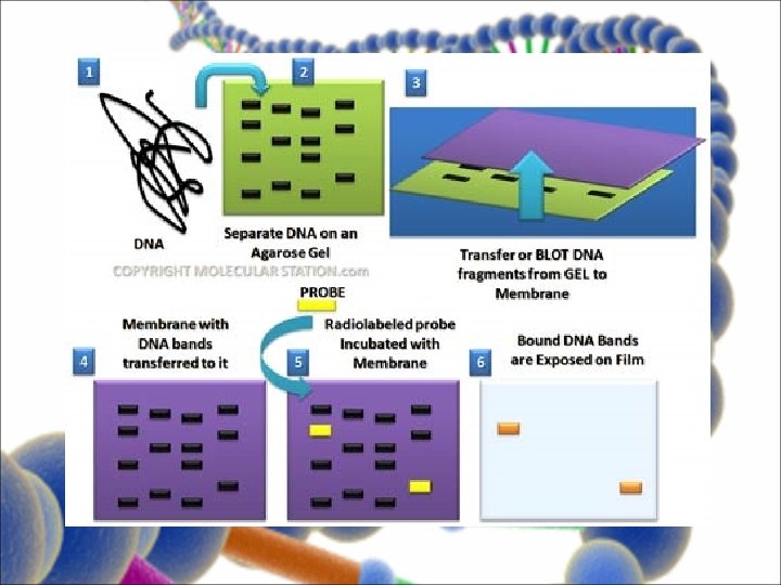 HIBRIDACIÓN DE ÁCIDOS NUCLEICOS • Mediante desnaturalización 1º y después renaturalización se pueden obtener hebras híbridas de cualquier tipo de Ácido Nucleico. • Generalmente se quieren localizar genes en los cromosomas o en regiones de estos. Se emplean SONDAS que pueden ser de ADN o de ARN. • Hibridación ADN-ADN Transferencia tipo Southern • Hibridación ADN-ARN Tecnica de transferencia de tipo Northern