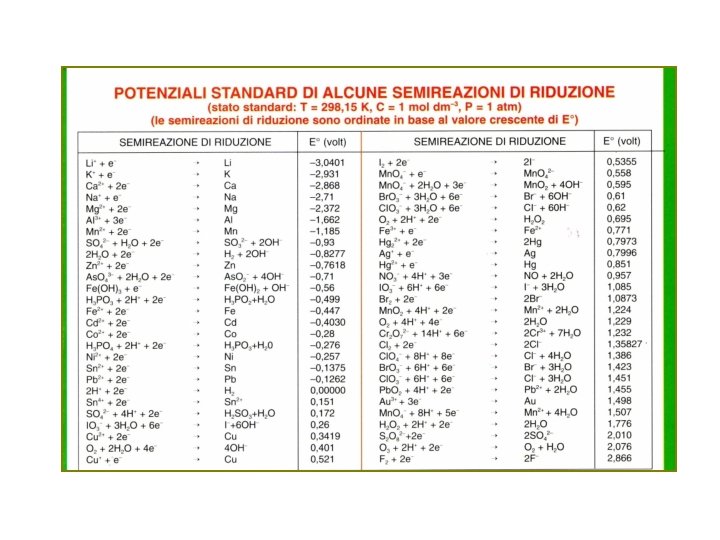 La serie elettrochimica dei potenziali standard • I valori sono tabulati come potenziali standard di riduzione; ogni semireazione elettrodica è riportata come riduzione • Il potenziale standard di riduzione di una certa coppia redox indica la capacità di questa coppia a comportarsi da ossidante o da riducente rispetto alla coppia H 3 O+/H 2 • Lo stesso criterio può essere facilmente esteso a qualsiasi altra coppia redox, confrontando i relativi potenziali standard • Calcolo immediato della f. e. m. standard (E°) di una cella formata da due semielementi qualsiasi (-) Zn Zn 2+(aq, 1 M) Cu 2+(aq, 1 M) Cu (+) E° = E°C-E°A = E°Cu 2+/Cu-E°Zn 2+/Zn = +0. 337 - (-0. 763) = +1. 100 V