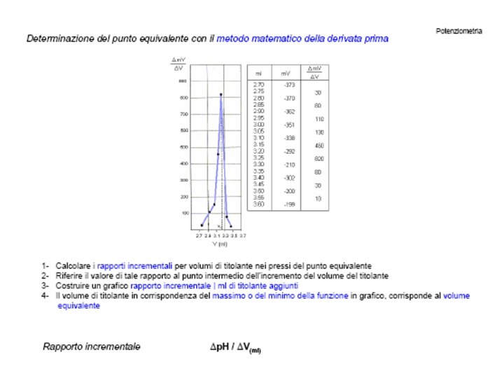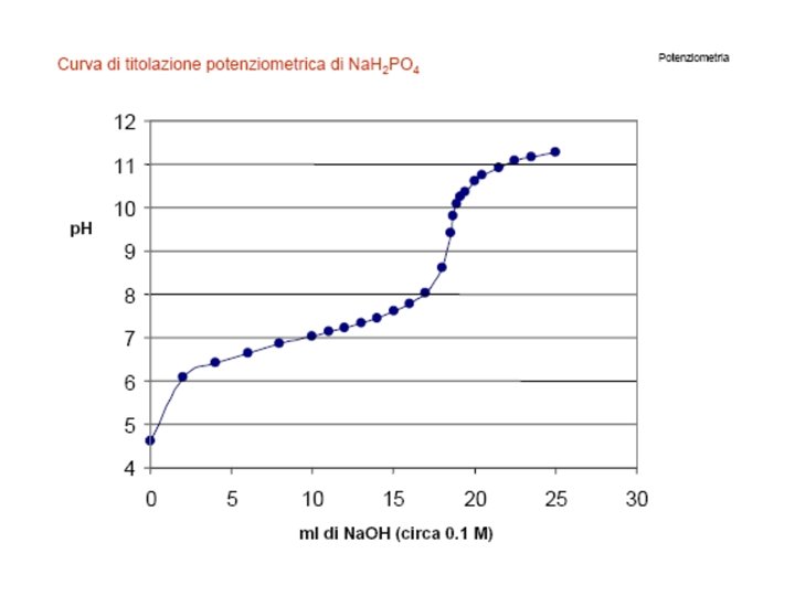 Come eseguire una titolazione potenziometrica in pratica 1 - La soluzione da titolare se troppo concentrata (>1 M) va diluita e posta in un becher con ancoretta magnetica 2 - Titolare con una soluzione a titolo noto con l’ausilio di una buretta azzerata 3 - La parte sensibile dell’elettrodo indicatore deve essere completamente immerso nella soluzione senza toccare le pareti del recipiente 4 - La soluzione deve essere mantenuta in agitazione senza creare turbolenze 5 - Effettuare aggiunte cospicue (0. 5 -2 ml) di titolante fino a 1 -2 ml prima del previsto punto equivalente (viraggio) 6 - Dopo ogni aggiunta di titolante assicurarsi che il sistema abbia raggiunto l’equilibrio 7 - Dopo ogni aggiunta di titolante registrare il volume totale di titolante aggiunto e il valore di p. H o i m. V misurati 8 - Nell’intervallo di viraggio, l’aggiunta di titolante deve essere tanto più piccola quanto più ripida è la curva di titolazione 9 - Effettuare aggiunte cospicue (0. 5 -2 ml) di titolante dopo il viraggio. Non è necessario tarare il piaccametro con soluzioni tampone perché il punto equivalente è individuato dalla variazione relativa del p. H