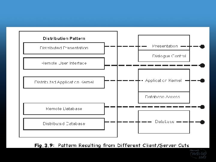Patrones de distribición Para distribuir un sistema de información mediante la asignación de roles a los componentes del cliente y servidor de la arquitectura por capas, tenemos que diferentes estilos para escoger. La siguiente figura muestra los estilos en que se construyen el patron: