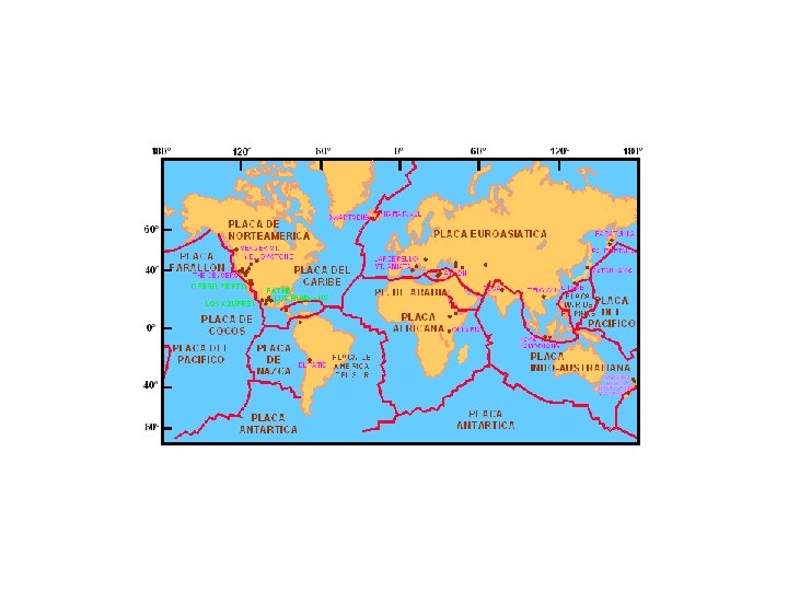 TECTÓNICA DE PLACAS Bordes Convergentes 1. Dos placas de litosfera oceánica a. La placa más antigua (más densa) subduce en el manto. b. Pocos terremotos, pero intenso vulcanismo formando los arcos insulares. 2. Placa oceánica y placa continental a. La litosfera oceánica se introduce bajo la continental y la deforma generando una cadena montañosa. b. Terremotos y magmatismo muy fuertes. Ej. Los Andes 3. Dos placas de litosfera continental. a. Ninguna penetra en el manto, aunque puede existir una pequeña subducción. b. Se forman cordilleras de colisión. Ej. Pirineos, los Alpes, el Himalaya.