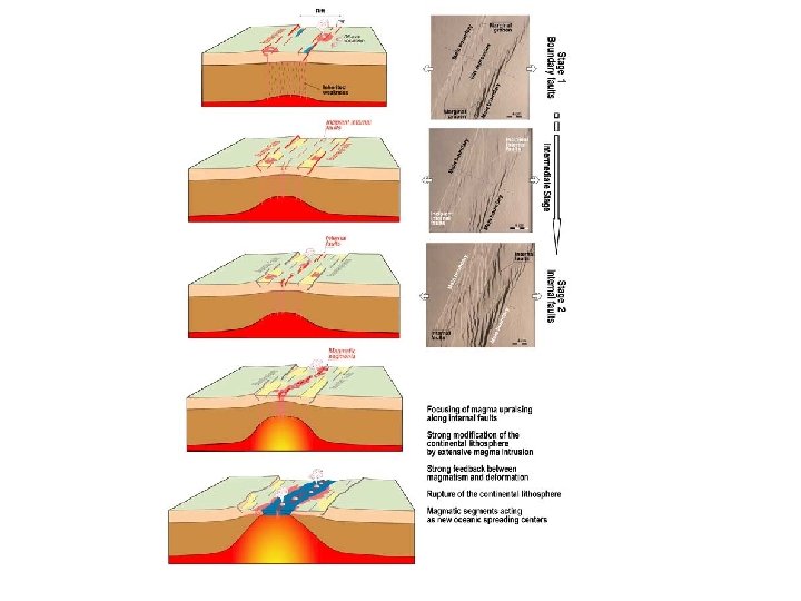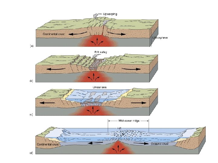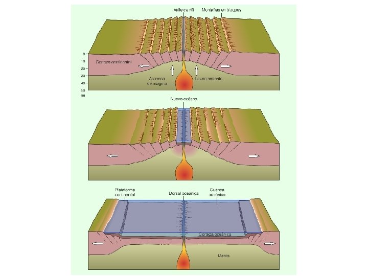 En la imagen se puede observar la región de los grandes lagos que es la zona por la que se está fracturando el continente africano desde el sur hasta el norte. El proceso de formación de una nueva cuenca oceánica, por fragmentación de un continente, es muy complejo y tiene lugar durante muchos millones de años. Comienza cuando bajo un continente aparece un punto caliente (que comentaremos con posterioridad). Inicialmente la corteza continental impide la salida del calor procedente del interior de la Tierra. Como resultado, se forma un abombamiento (domo) que genera tensiones que terminan rompiendo la litosfera formándose un conjunto de fallas normales (fallas producidas por el hundimiento de bloques de la corteza), como se muestra en la imagen inferior.